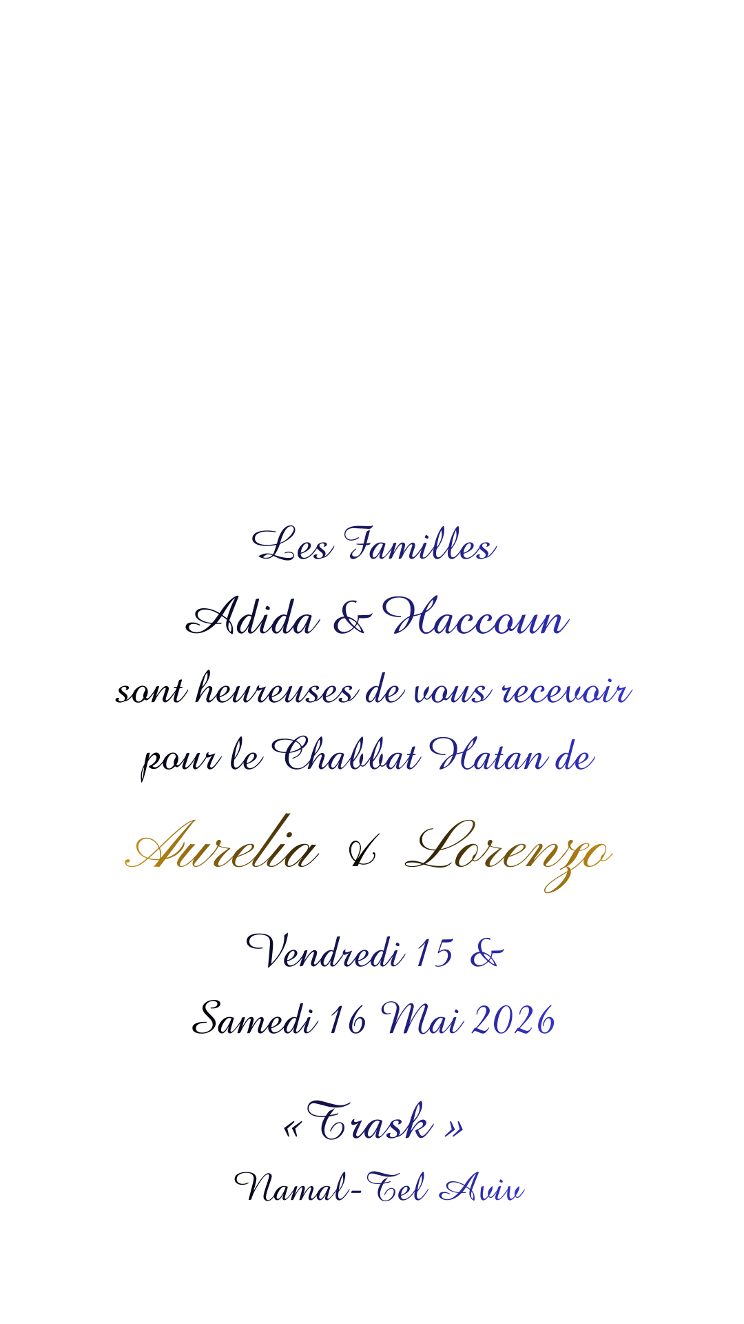 Les familles Slakmon et Scemama seraient heureuses de vous recevoir pour le Chabbat Hatan de